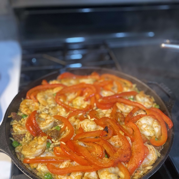 Pat rice mixture evenly into the bottom of the skillet. Arrange shrimp in a single layer over the top of the rice. Lay pepper strips around and in between shrimp; season with salt, paprika, and cayenne pepper.