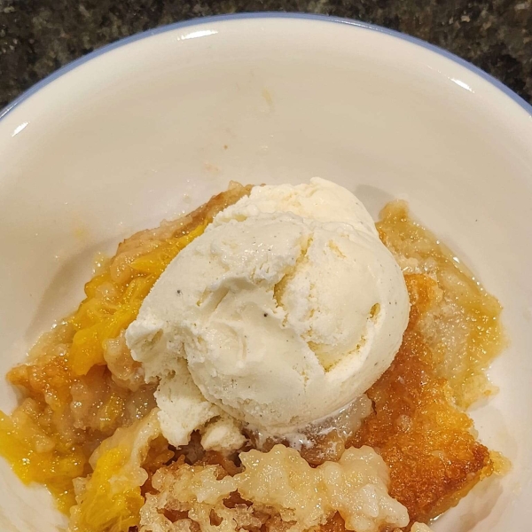 This easy, 5-ingredient peach cobbler comes together in minutes and bakes to sweet perfection in minutes. Serve this dessert warm with vanilla ice cream.