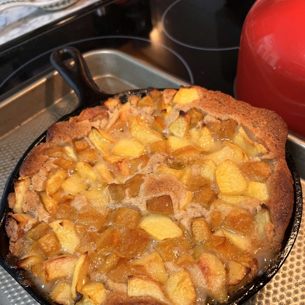 Pour melted butter into a 2-quart baking dish (or a 9- or 10-inch cast iron skillet). Pour flour-milk mixture over top.