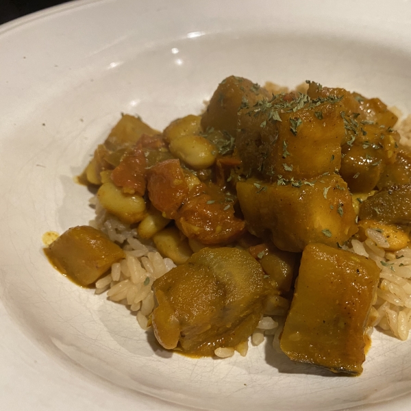 This hearty eggplant stew is simmered with tummy-warming Indian spices and served over rice for a delicious dinner that really delivers on taste.