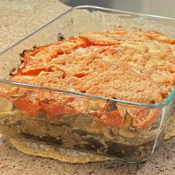 Spread eggplant mixture evenly across the bottom of the prepared casserole dish; sprinkle with a few tablespoons of Parmesan cheese. Spread zucchini in an even layer over top. Lightly salt and sprinkle with a little more cheese. Continue layering in this fashion, with tomatoes, mushrooms, onion, and bell pepper, covering each layer with a sprinkling of salt and cheese.