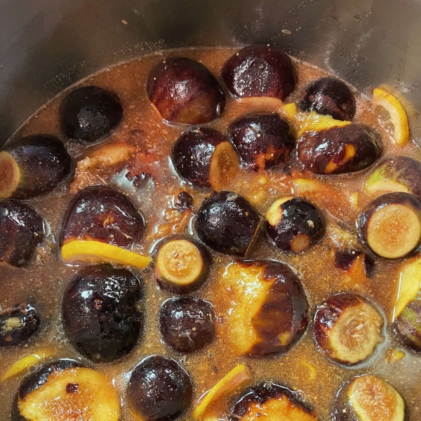 Bring mixture to a boil over medium heat. Reduce the heat and simmer, stirring gently a few times to keep figs from burning onto the bottom, until figs are golden brown and coated in syrup, about 1 hour. Add salt to tame the sweetness if desired.