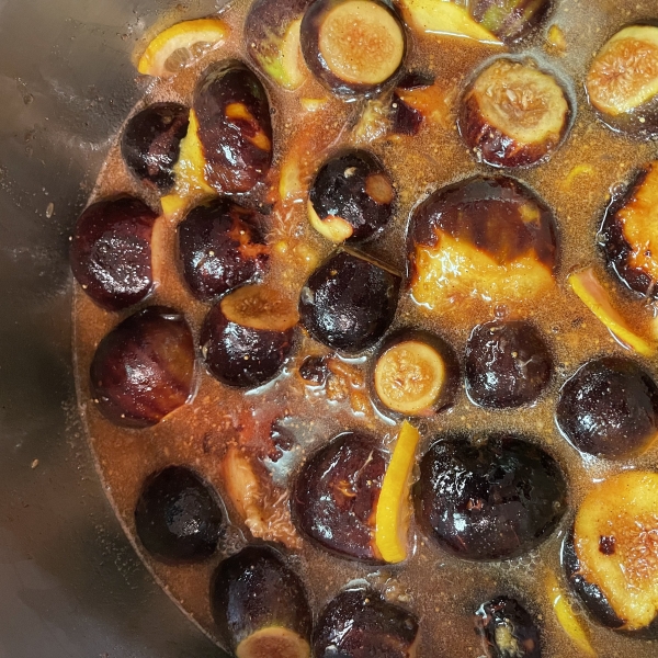 Bring the mixture to a boil over medium heat; reduce heat to a simmer, and cook until the figs are golden brown and coated in syrup, about 1 hour. Stir gently a couple of times to keep the figs from burning onto the bottom of the pot. Add a pinch of salt, if desired, to tame the sweetness.