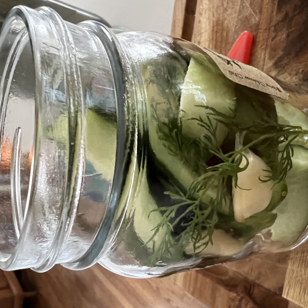 Pour cooled vinegar mixture over cucumbers, garlic, and dill. Seal container with lid and refrigerate for at least 3 days.