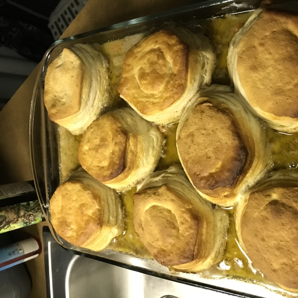 Pour the beef mixture into the prepared baking dish and top with biscuits.