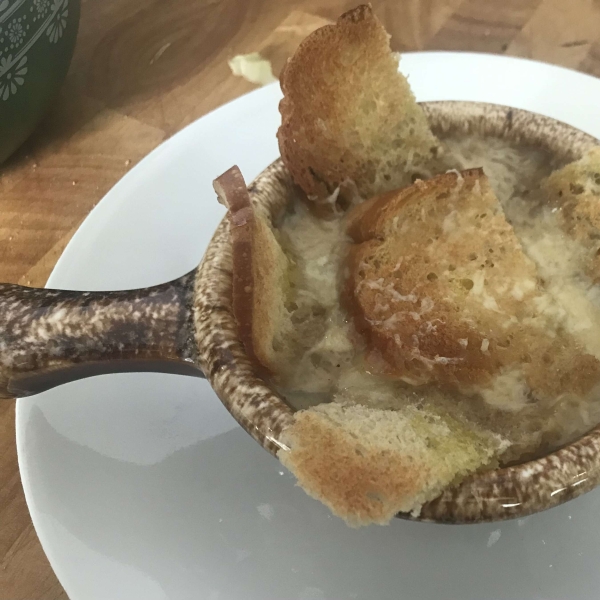 This simple French onion soup is made rich with a broiled bread topping and three types of cheese, making it a perfect recipe choice for cold nights.
