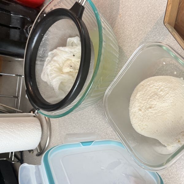 Scoop curds into a sieve lined with several layers of cheesecloth using a slotted spoon. Fold the edges of the cheesecloth over the curds and let drain over a bowl at room temperature, 20 to 30 minutes.