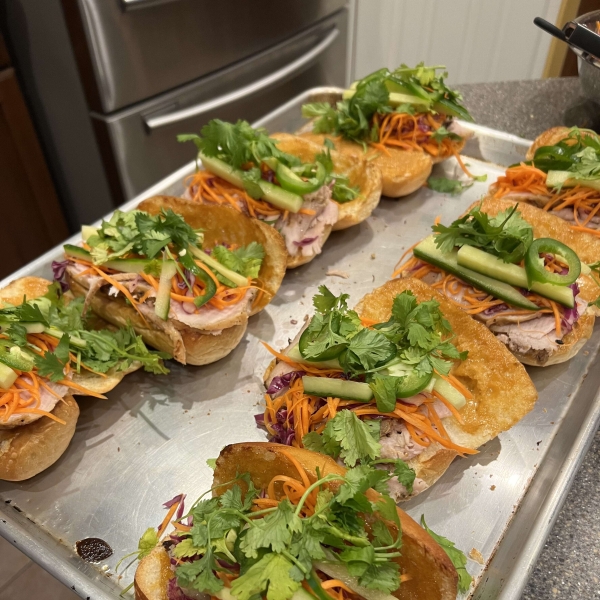Place sliced pork, paté, pickled radish and carrot, cucumber, jalapeño, and cilantro leaves in warm roll. Cut in half to serve.