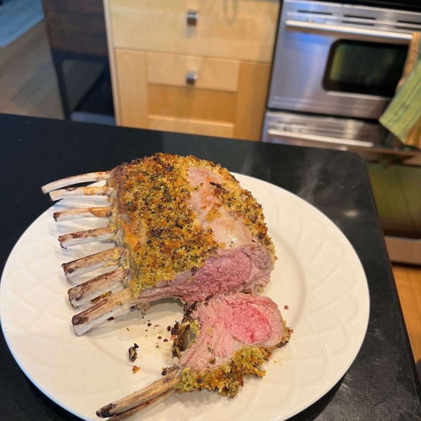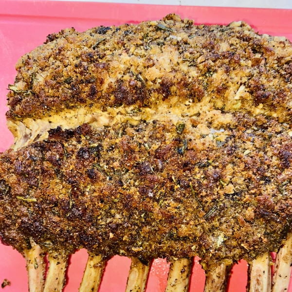 A rack of lamb is seared, coated with mustard, and encrusted with garlic and rosemary-flavored bread crumbs before it's roasted to perfection.
