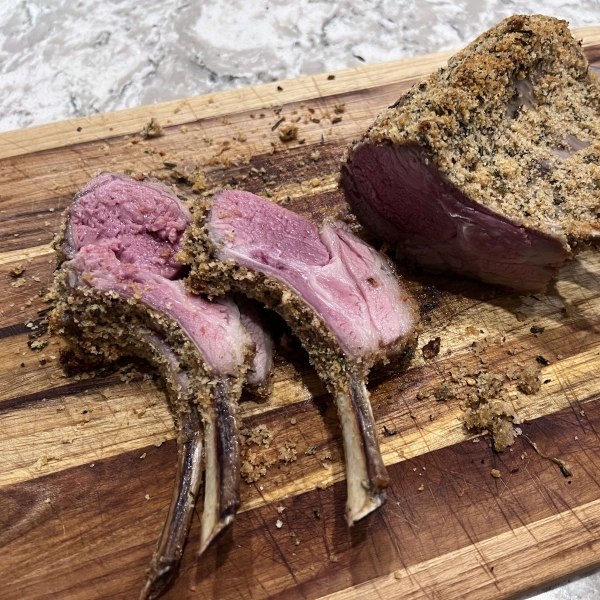 A rack of lamb is seared, coated with mustard, and encrusted with garlic and rosemary-flavored bread crumbs before it's roasted to perfection.