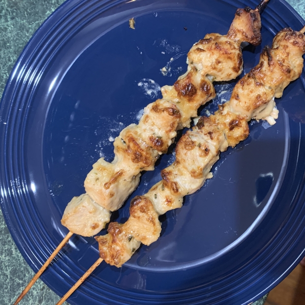 Lightly oil the grill grate. Grill skewers for 8 to 12 minutes, or until the chicken is no longer pink in the center, and the juices run clear.