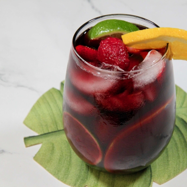 Sangria is a Spanish wine punch that includes chopped fruit and sparkling water for a refreshing summertime cooler.