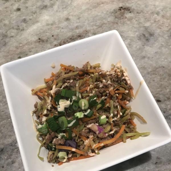 This sausage egg roll in a bowl with greated vegetables and ground pork is a unique recipe for a deconstructed egg roll without the fried wrapper.