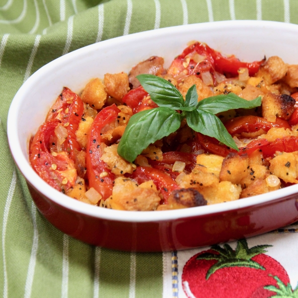 These scalloped tomatoes are made with basil, brown sugar, bread cubes, and onions cooked with thick, juicy slices of tomato and baked in the oven until your kitchen smells wonderful.