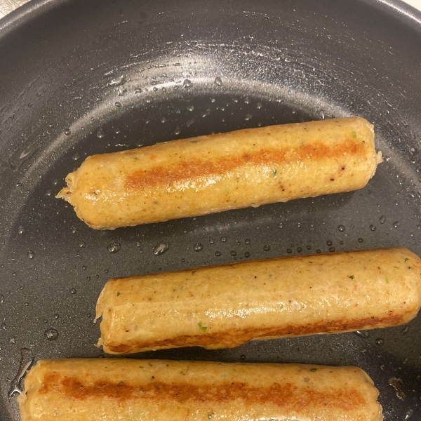 Peel foil off of the sausages over a piece of paper towel. Snip off 1 end of the plastic wrap and squeeze the sausage out through the opening. Trim off any unsightly chunks.