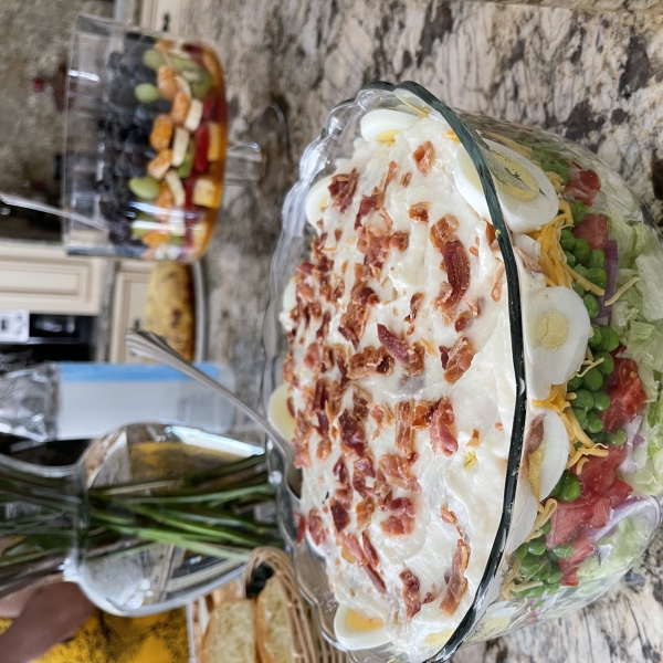 I usually make this bacon, lettuce, onion, pea, cheese and cauliflower layered salad in a large flat bowl. There's never too much because everybody loves it! You can vary the salad by substituting green onions for red, jack cheese for the Cheddar, etc.