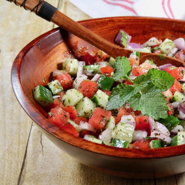A tasty Persian salad which originated in the town of Shiraz in Southern Iran. Almost always served as a side dish, it's crunchy, bright, refreshing with a mild citrus-flavored dressing, and is served year-round.
