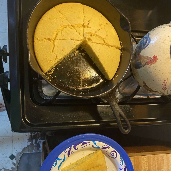 This tasty skillet cornbread is simple to make with pantry ingredients and a trusty cast iron skillet. Enjoy this slightly sweet bread with any meal.