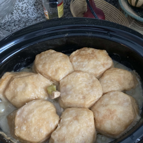 About 30 minutes before serving, tear biscuit dough into pieces. Place dough in the slow cooker. Cook until dough is no longer raw in the center.