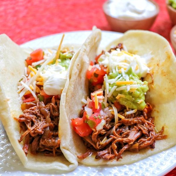 Beef simmers in a slow cooker with onion and taco seasoning for a meat filling you can serve in tacos, burritos, taquitos, or whatever other use you can imagine for it.