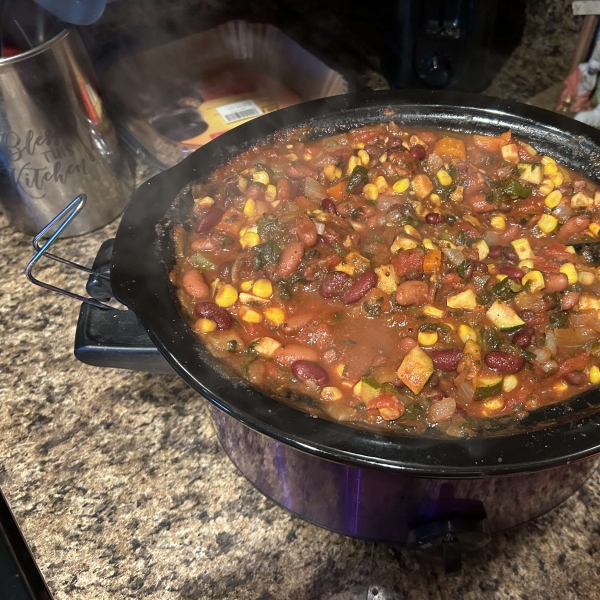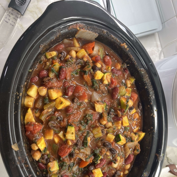 This vegan chili is packed with rich and colorful vegetables, spices, and three kinds of beans for a hearty and crowd-pleasing slow cooker meal.