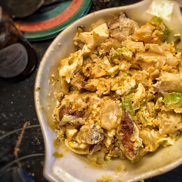 This Southern potato salad is served warm and is a classic with mayonnaise, sweet pickle, garlic, mustard, bits of celery, and diced hard boiled eggs.