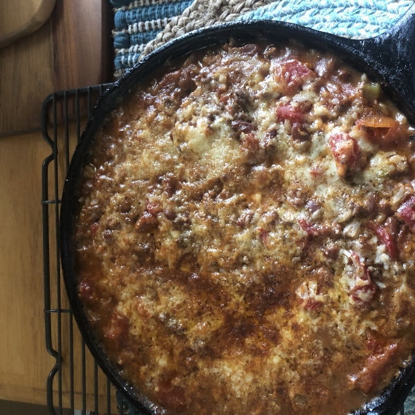 Ground beef, fresh onion, green bell pepper, tomatoes and rice are simmered in a sweet-hot sauce of chile, brown sugar, cumin and Worcestershire. This savory rice dish is then baked with Cheddar and garnished with fresh cilantro.