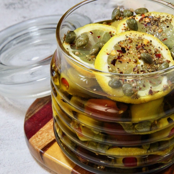 Fill a layer of 1/3 of the olives into a 16-ounce jar. Top with 3 slices of lemon and sprinkle with 1/3 of the capers, coriander seeds, peppercorns, and red pepper flakes. Repeat the layers 2 more times.