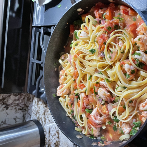 This is a very tasty, quick dish made up by one of my work colleagues. Shrimp are sauteed with fresh tomatoes, parsley, lemon, and chile peppers, and served over pasta of your choice. I prefer fettuccine.