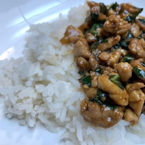 My version of this classic Thai dish has spectacular taste even with regular basil instead of Thai or holy basil. The sauce actually acts like a glaze as the chicken mixture cooks over high heat. The recipe works best if you chop or grind your own chicken and have all ingredients prepped before you start cooking.