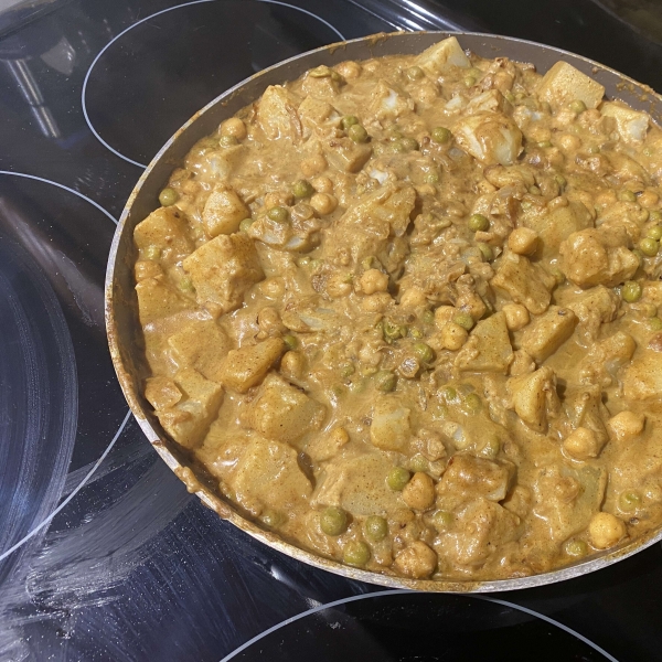 Add cooked potatoes, garbanzo beans, peas, and tomatoes. Pour in coconut milk; bring to a simmer and continue cooking for 5 to 10 minutes.