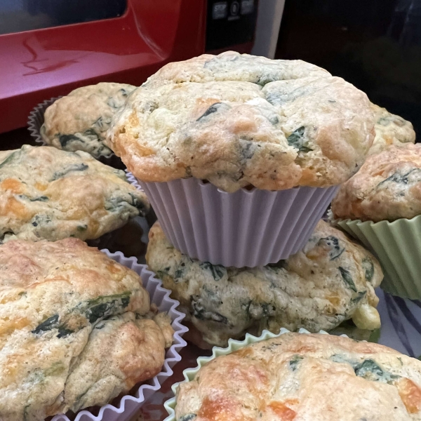 A savory combination of spinach and shredded Cheddar cheese makes these muffins perfect for brunch. The spinach flavor mellows as the muffins cool.