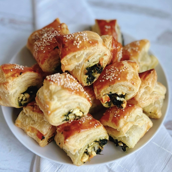 Spinach rolls with puff pastry and feta are a great vegetarian finger food for parties or when you have friends over for a glass of wine.