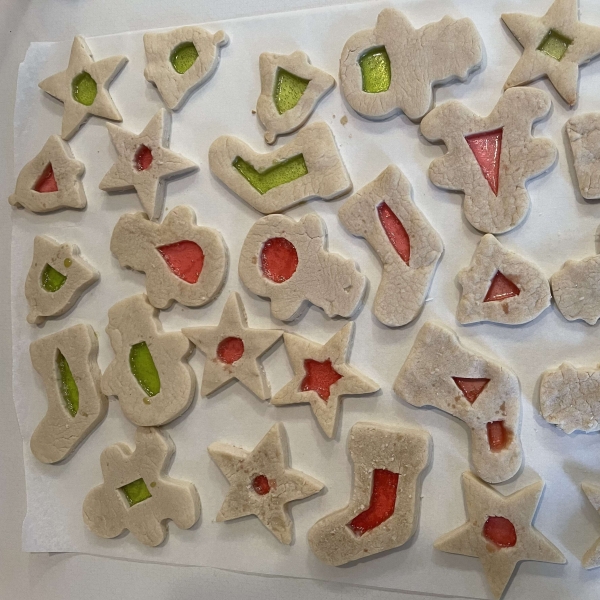 Unwrap and place same or similar colored candies in separate zip-top bags. Use a rolling pin to roughly crush candies in bag (do not crush into a fine powder, pebble-sized pieces are okay). Fill each emptied center of cookie shapes about 2/3 full with crushed candy pieces.