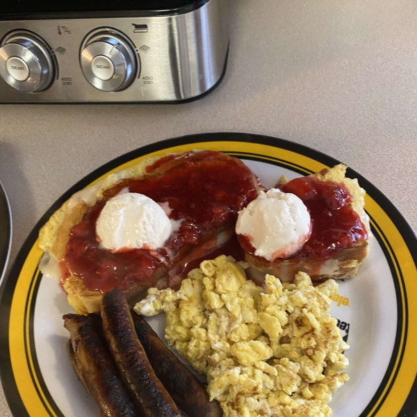 To serve, top French toast with warm strawberry glaze and sliced fresh strawberries and sprinkle with confectioners' sugar. Serve with a dollop of whipped cream.
