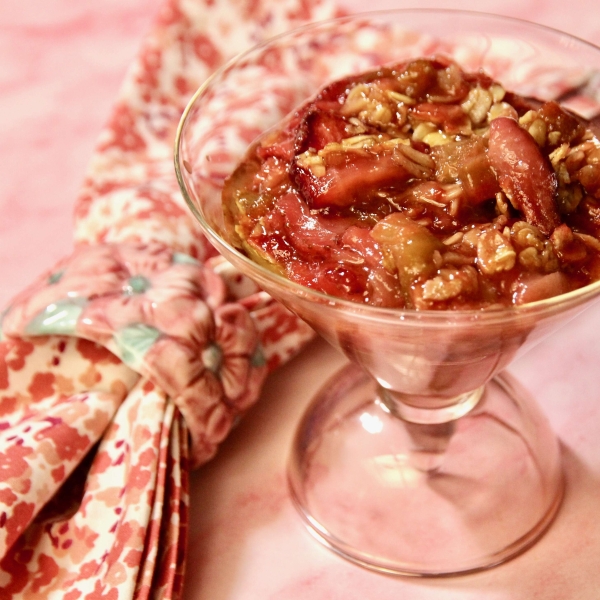 Make the topping: Combine 1 ½ cups flour, brown sugar, oats, and butter and mix until crumbly. You may want to use a pastry cutter for this. Sprinkle on top of the rhubarb and strawberry layer.