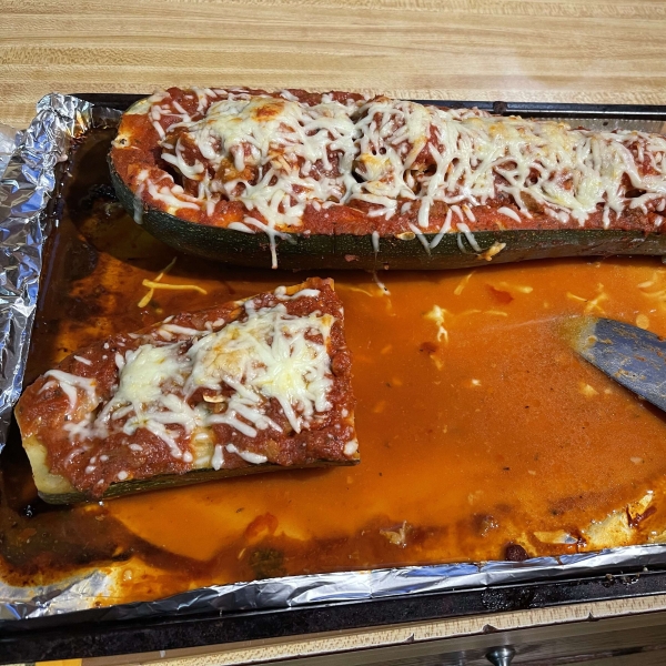 These stuffed zucchini halves have a hearty and delicious savory stuffing made with pork sausage, bread crumbs, garlic, and Parmesan cheese.