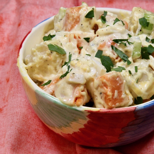 This sweet potato salad is made with white potatoes and sweet potatoes, mayonnaise, a bit of mustard, celery, and hard-boiled eggs for a unique, tasty salad.