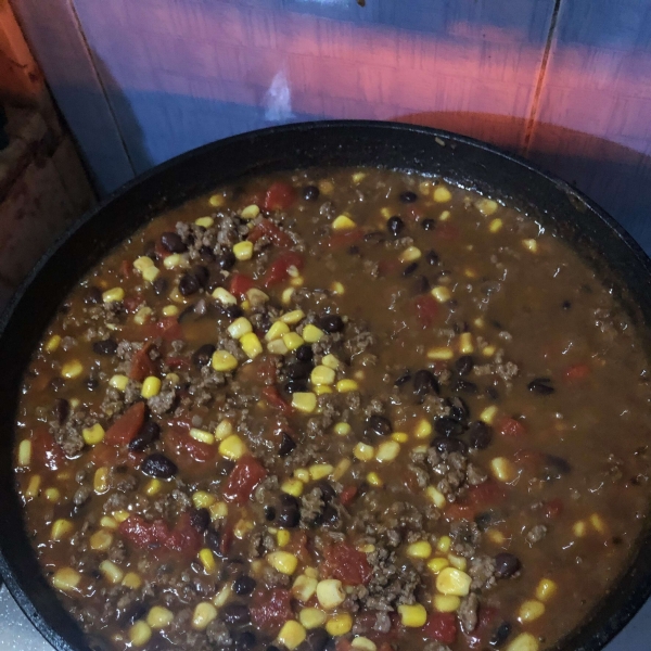 Heat a large nonstick skillet over medium-high heat. Cook and stir ground turkey in the hot skillet until browned and crumbly, 5 to 7 minutes. Stir in corn, black beans, diced tomatoes, and taco seasoning. Bring to a simmer and cook until heated through, 10 to 12 minutes.