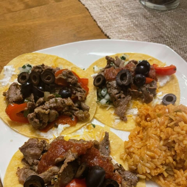 Tender carne asada tacos with flavorsome strips of marinated steak in soft tortillas with homemade spicy salsa and cotija cheese - just like you'd get at a taqueria!