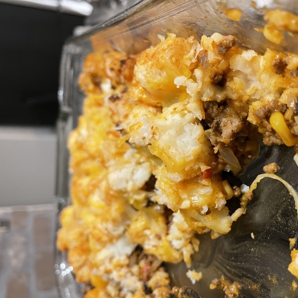 Combine ground beef mixture in a large bowl with about 3/4 of the Mexican cheese blend and the tater tots; stir to combine.