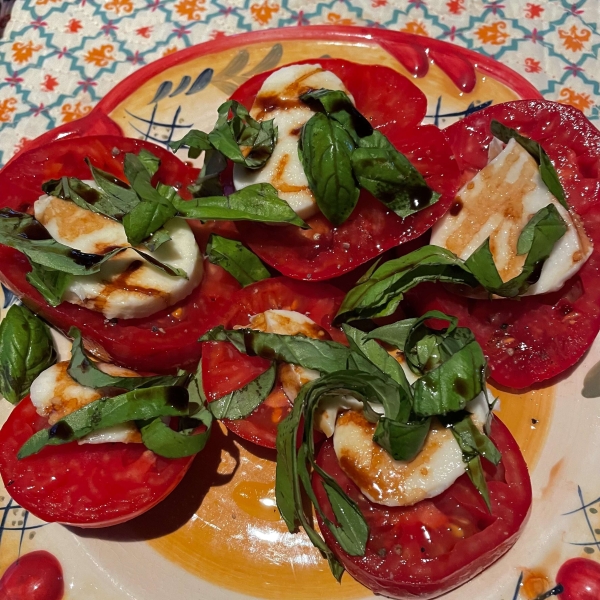 This caprese salad is as simple as can be, a quintessential combination of fresh mozzarella, tomato slices, basil leaves, and a drizzle of olive oil.