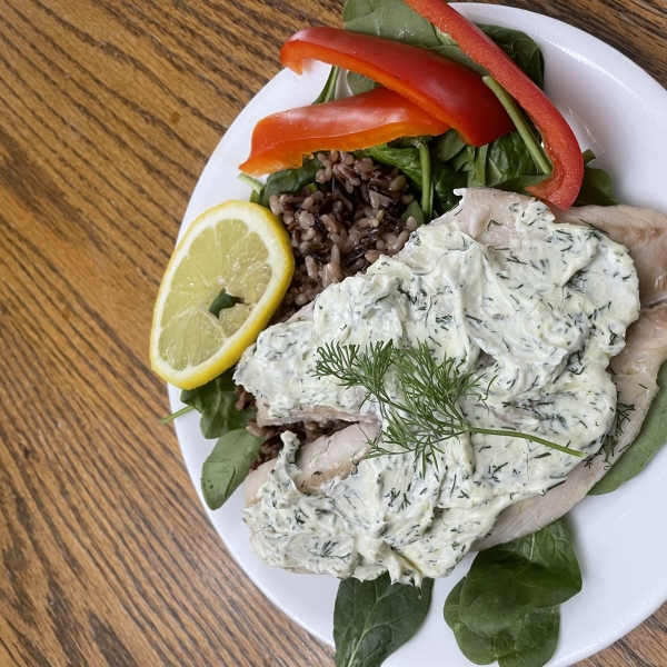 While the fish is baking, combine the cream cheese, 5 tablespoons of lemon juice and 2 tablespoons of dill in a small bowl. Heat in the microwave for 1 minute and 10 seconds, then stir to blend.