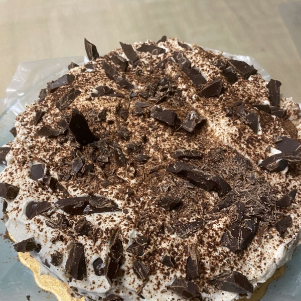 Garnish cake: Place cocoa powder in a sieve and lightly dust top of cake. Run a vegetable peeler down the edge of chocolate square to form curls. Scatter chocolate curls over cake.