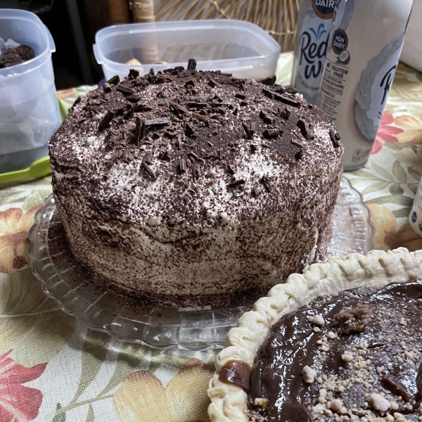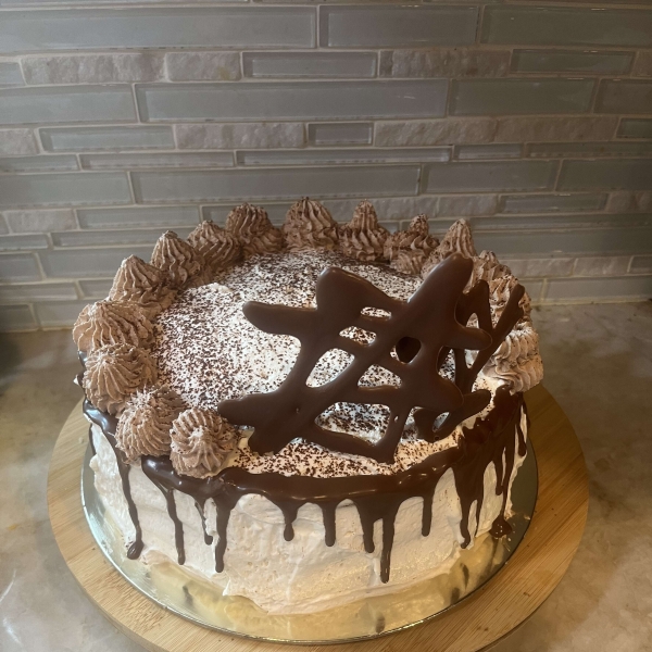 Assemble cake: Place 1 plain cake layer on a serving plate. Using a thin skewer, poke holes in cake, about 1 inch apart. Pour 1/3 of the coffee syrup over cake, then cover with 1/2 of the filling. Top with coffee-flavored cake layer; poke holes in cake. Pour another 1/3 of the coffee syrup over cake and cover with remaining filling. Top with remaining cake layer; poke holes in cake. Pour remaining coffee syrup on top. Spread sides and top of cake with frosting.