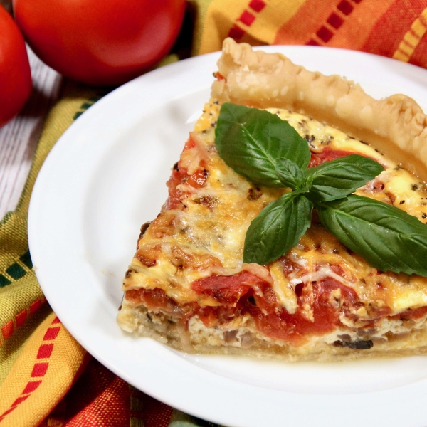 A delightful tomato quiche with cheese, onion, and basil that's easy to make with a prepared pastry crust but tastes like you spent all day in the kitchen!