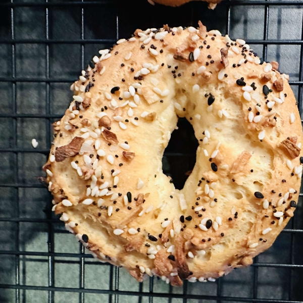 Allow the bagels to rest for 15 minutes. Spray with cooking spray and sprinkle with everything bagel seasoning.