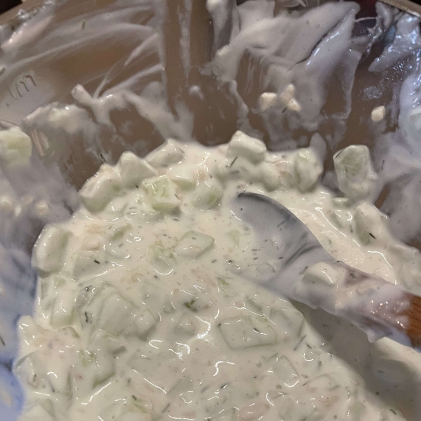 In a mixing bowl combine the cucumber with Greek yogurt, garlic, olive oil, dill, lemon juice, salt, and pepper. Stir until well combined.