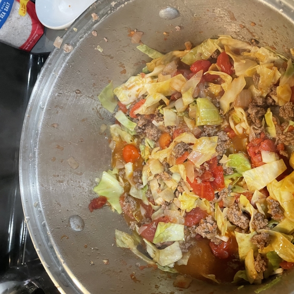 This is an easy casserole made with ground beef, cabbage, garlic, and tomatoes. My kids don't even like cabbage, but they love this. Serve with rice for a comforting weeknight dinner. Also, the longer it stands the better it tastes!