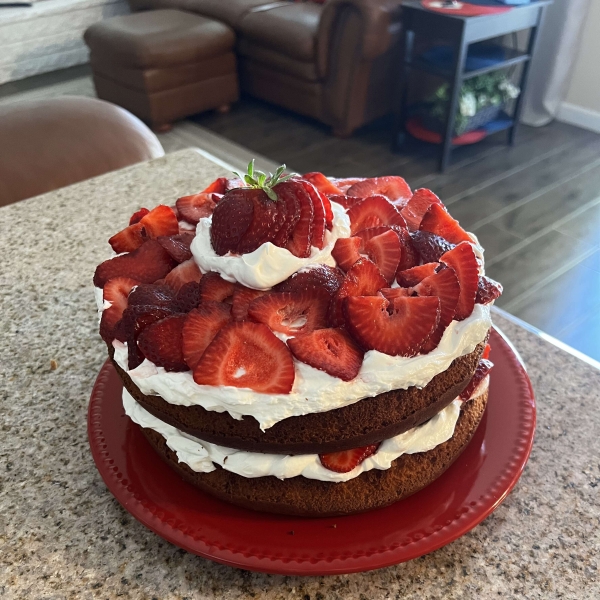 Strawberry layer cake made with fresh strawberries, cream, vanilla pudding, and vanilla cake is always a crowd-pleasing hit!